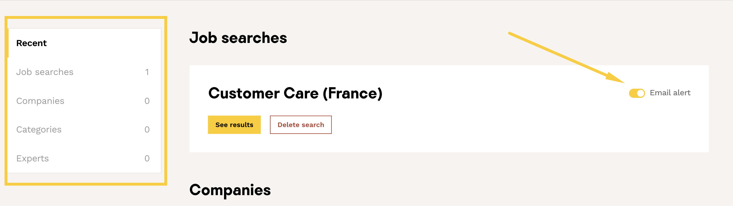 You can find your preferred companies or your saved search in the "Alerts" page: