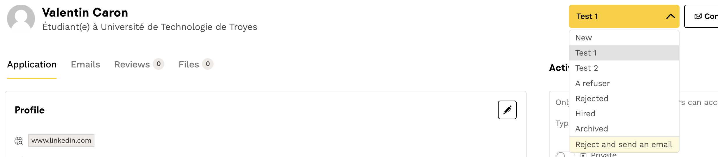 - "Default Rejection Email" Template: used with the "Reject and send an email" button available on each candidate profil
