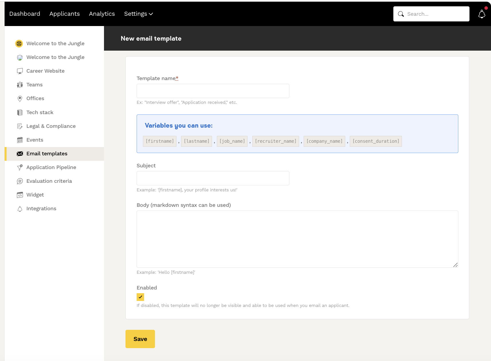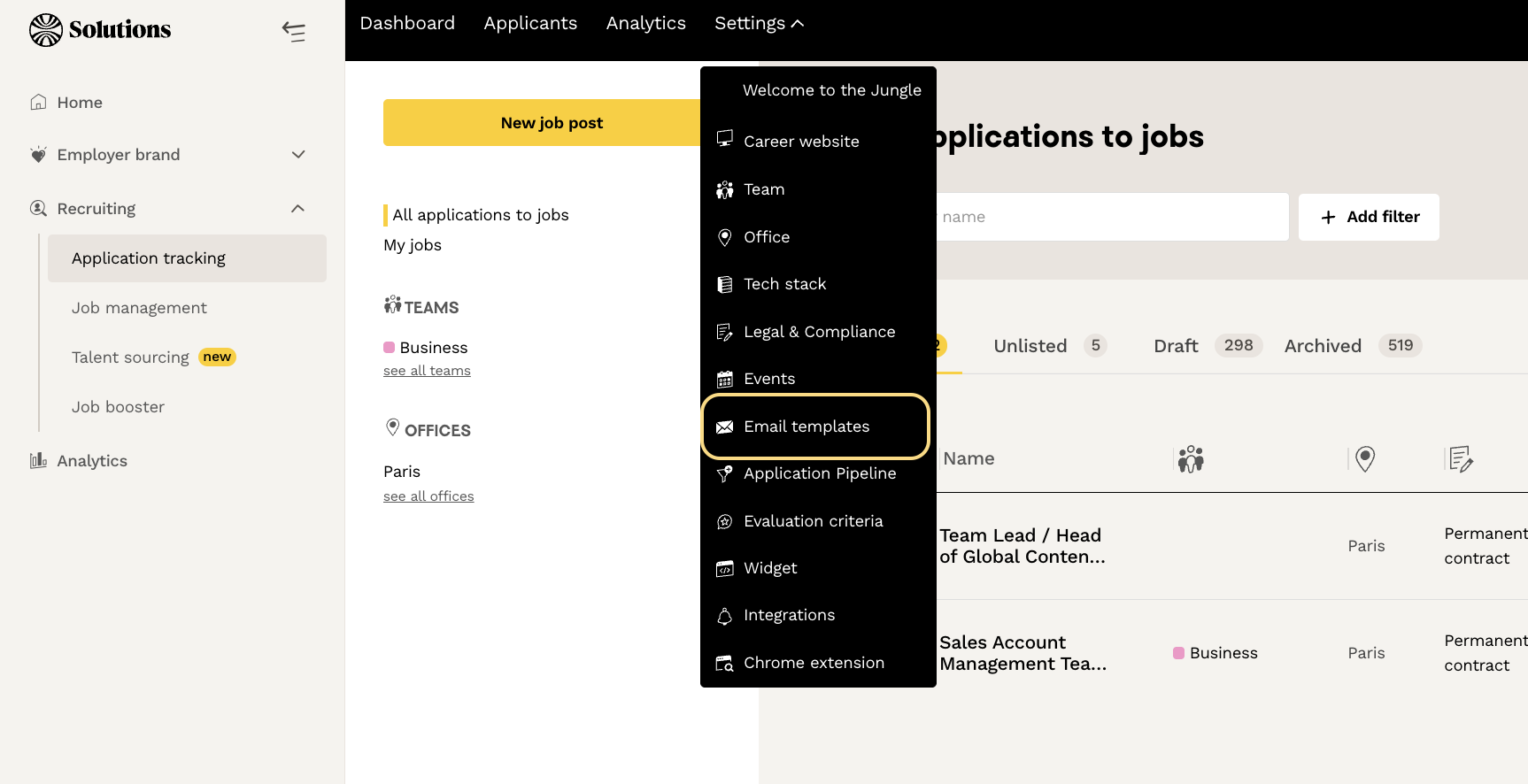 Welcome to the Jungle Solutions ATS admin area Settings Email Templates
