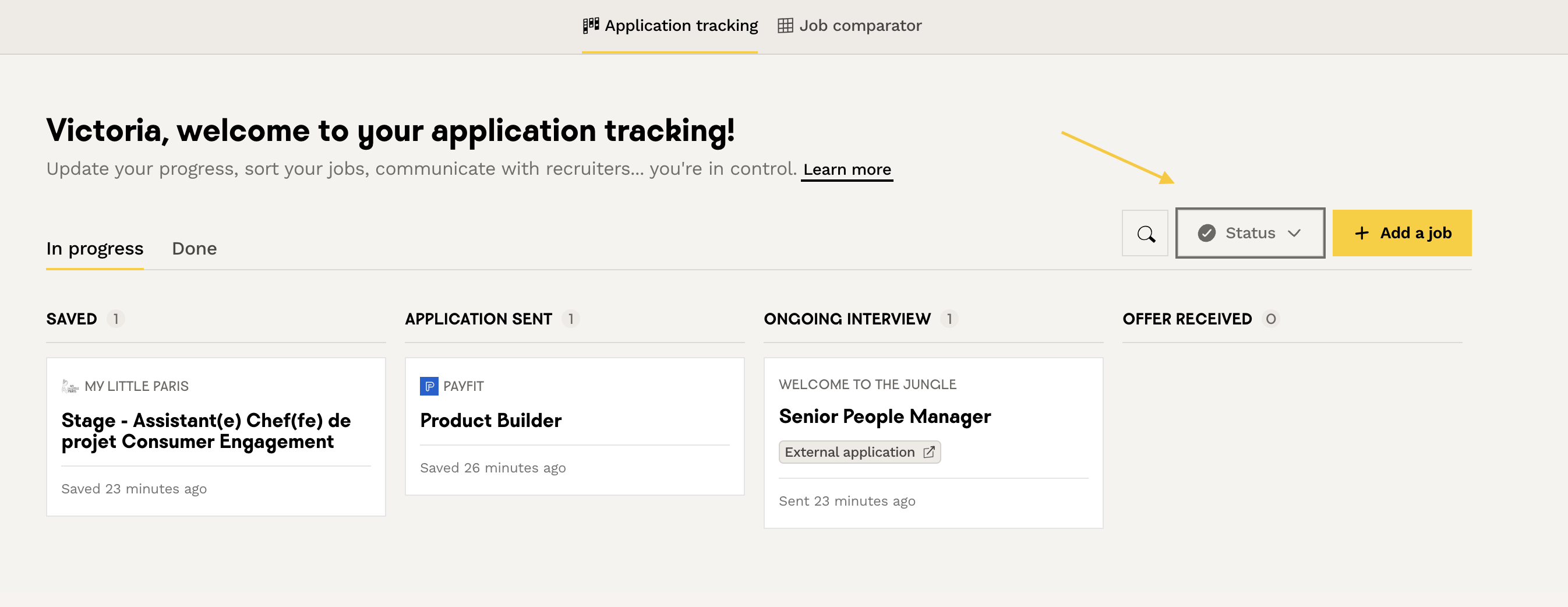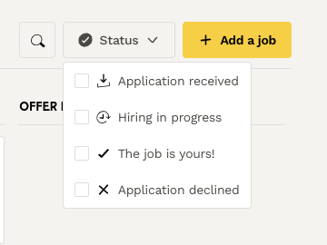Your applications are automatically categorized by different statuses that you can filter: 💙 Application received 💛 Recruitment in progress 💚 You got the job! ❤️ Application declined