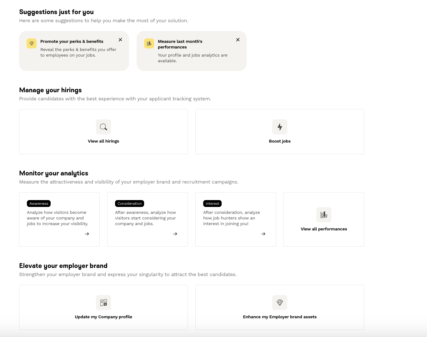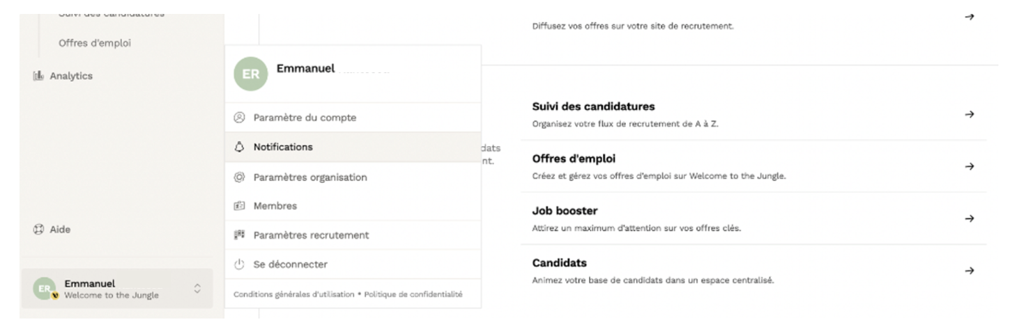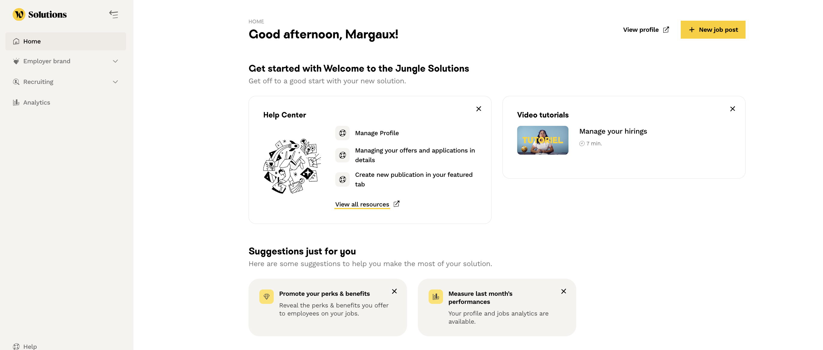 - Recruitment: This is where you'll access Welcome to the Jungle Solutions ATS to manage your job postings and candidates