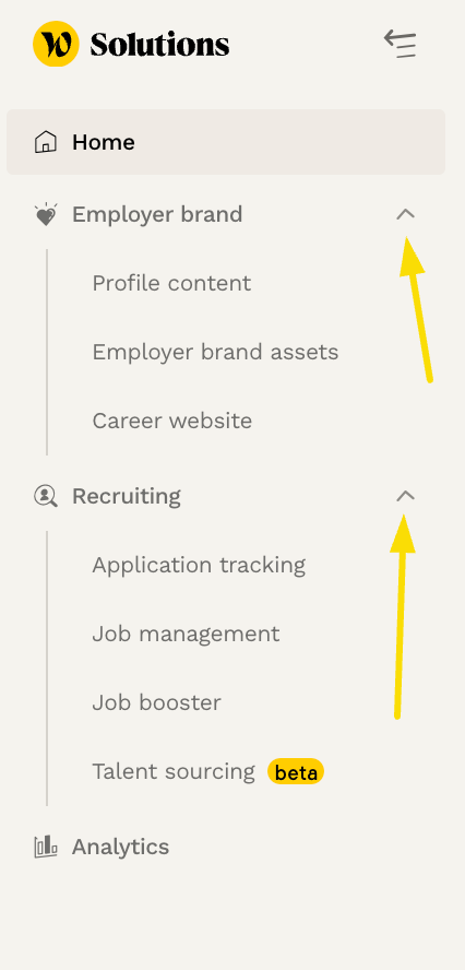 - Employer Brand: This is where you'll find the Showcase Editor, Employer Brand Modules, and your Career site settings.