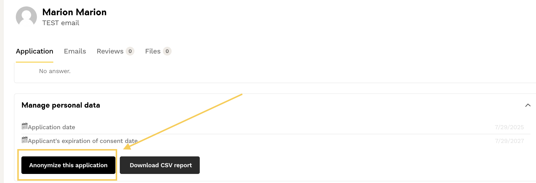⚠️ Important: Anonymization is irreversible and erases all personal data (first name, last name, email, phone, CV, etc.) while keeping the application archived.