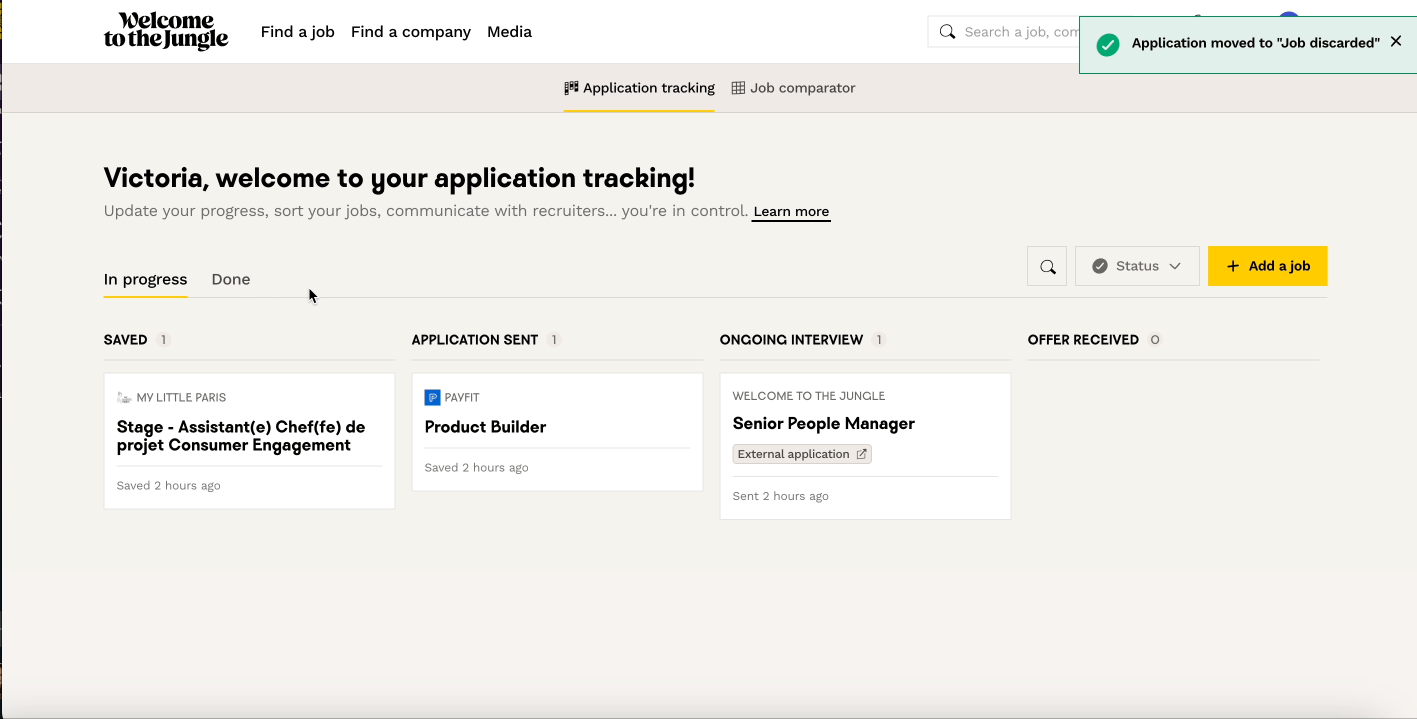 Unfortunately, in this second case, we won't be able to track your application from your Welcome to the Jungle candidate space. The company will get back to you directly by e-mail once your application has been processed.
