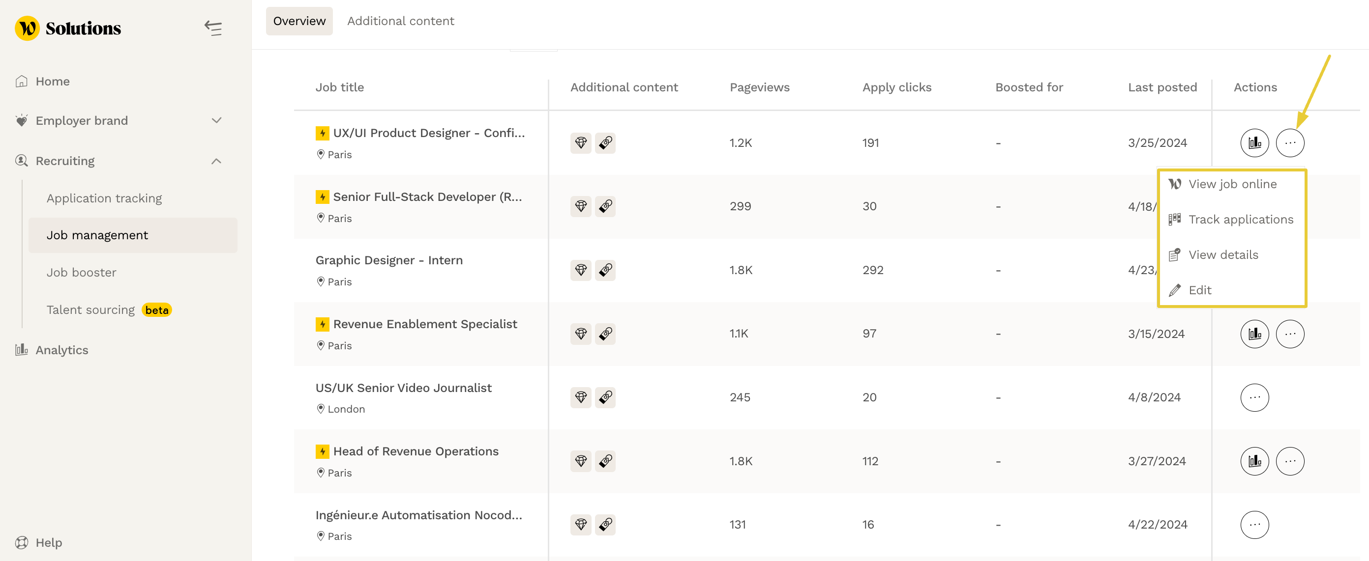 - "Edit": Allows you to modify the job post directly from this space (accessible only for companies using the Welcome to the Jungle Solutions ATS).