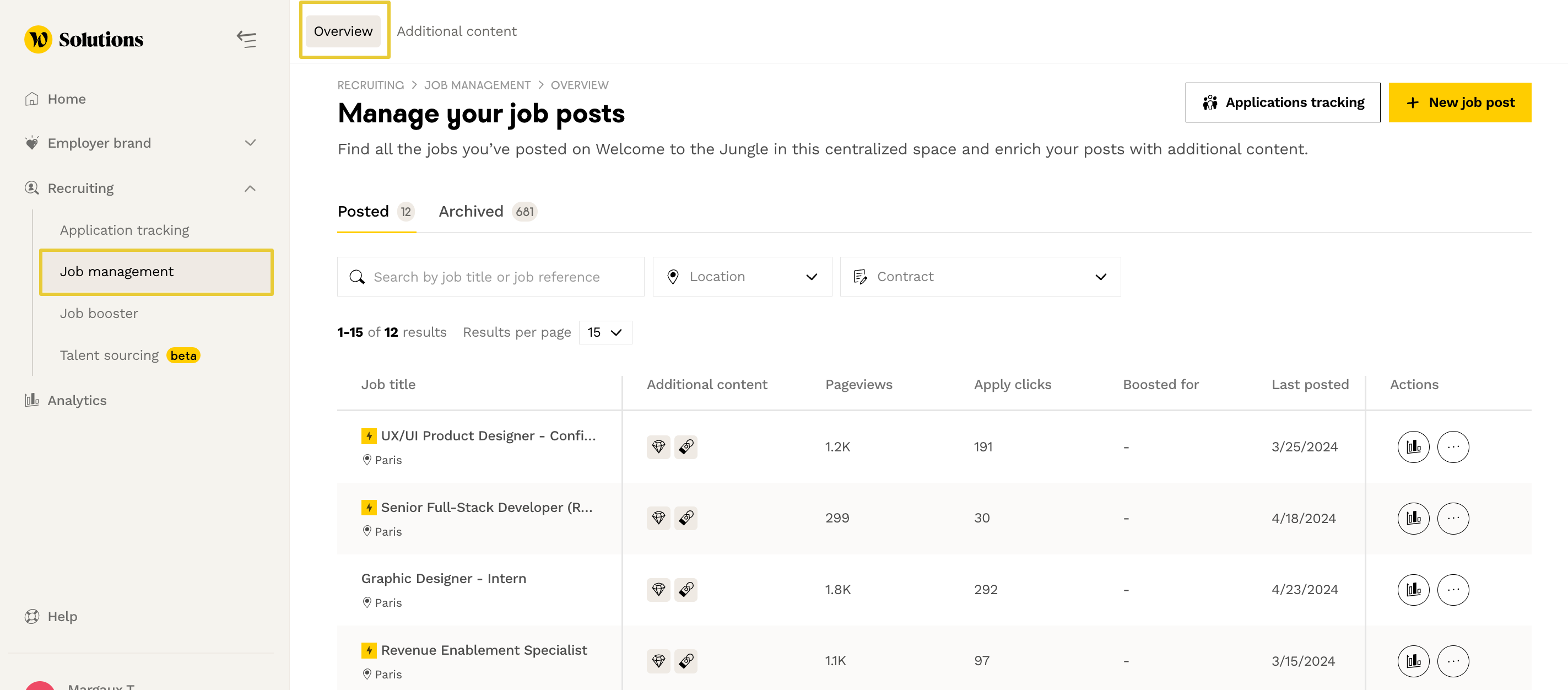 💡 The "Job Management" section has been designed to provide you with an overview of the job posts currently published on your platform, allowing you to manage them effectively from a single space. Whether you're using the Welcome to the Jungle ATS or an external ATS, this information will be available in both cases!