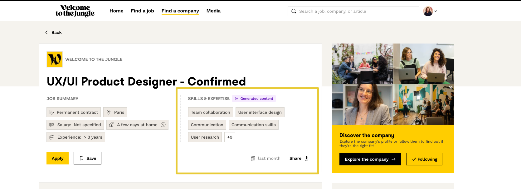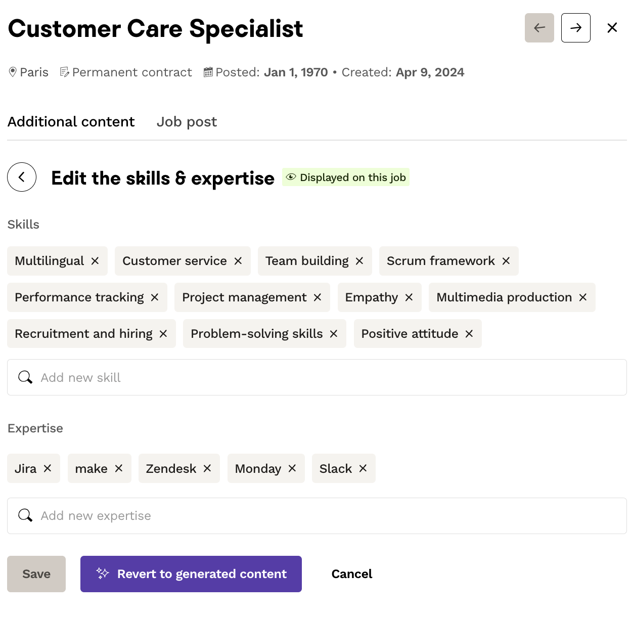 This feature allows you to automatically display an overview of the skills required for the job. It is generated by default by an AI, but it is possible to edit this information from the job post in question, by clicking on the additional content "skills & expertise" then "edit":