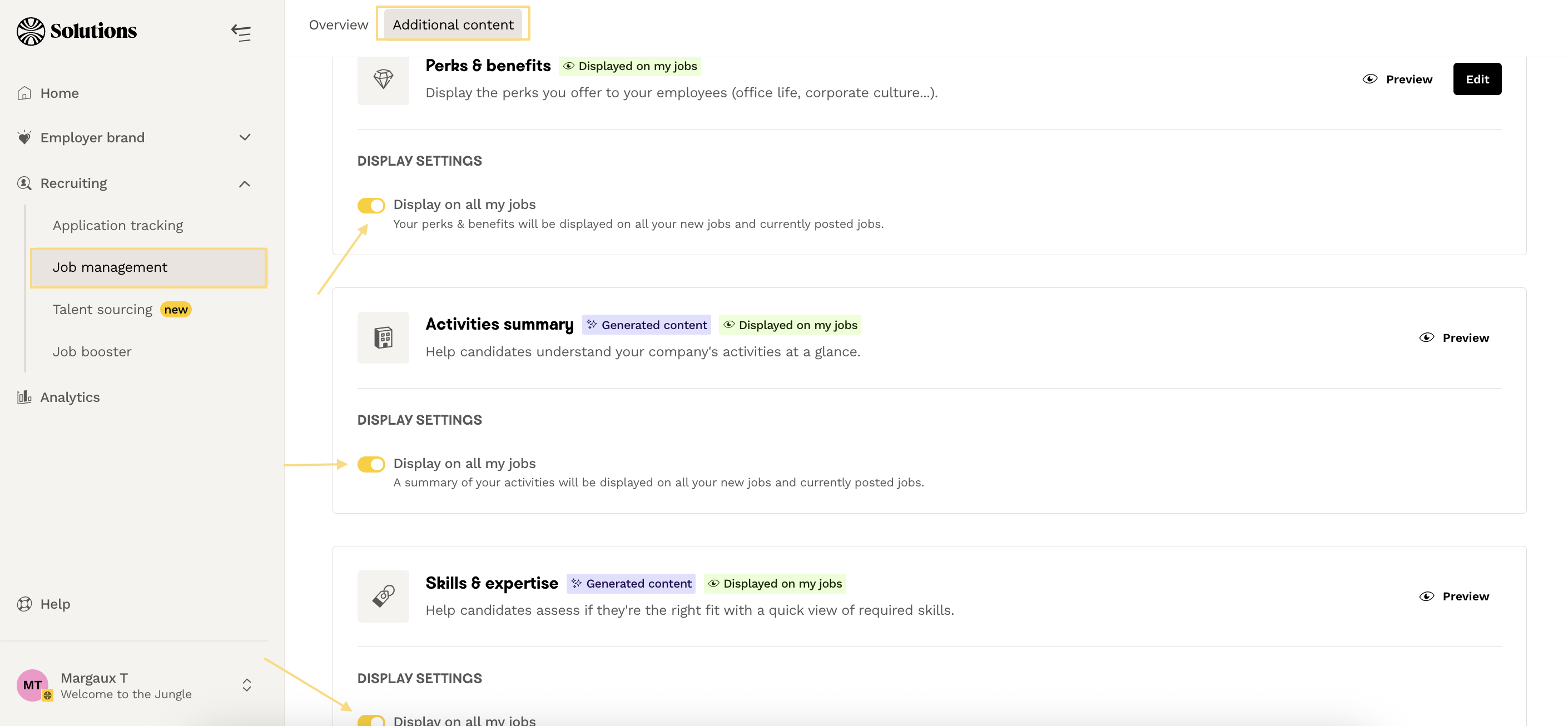 From this page, you can choose to activate or deactivate by default all additional content on all your jobs, including: