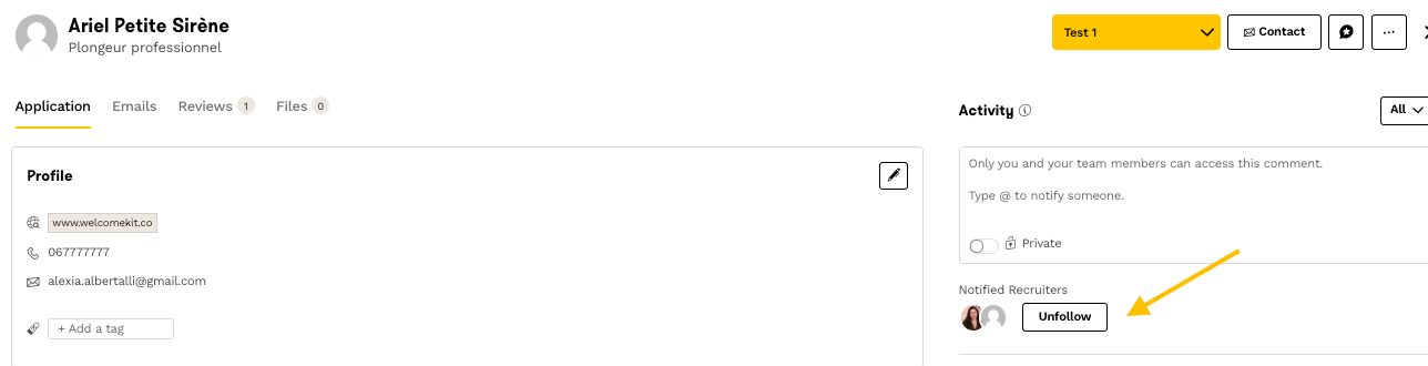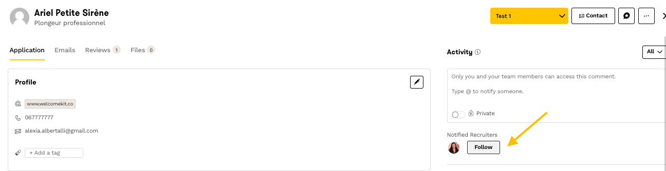 You can follow several candidates to receive notifications as soon as one of them replies to you or one of your colleagues adds a comment to a record.