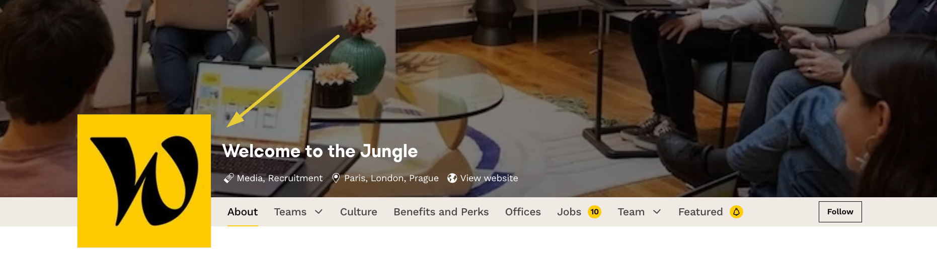 - You first need to upload your company logo (maximum size 2 MB). This is the logo displayed on your Welcome to the Jungle profile, as shown below.