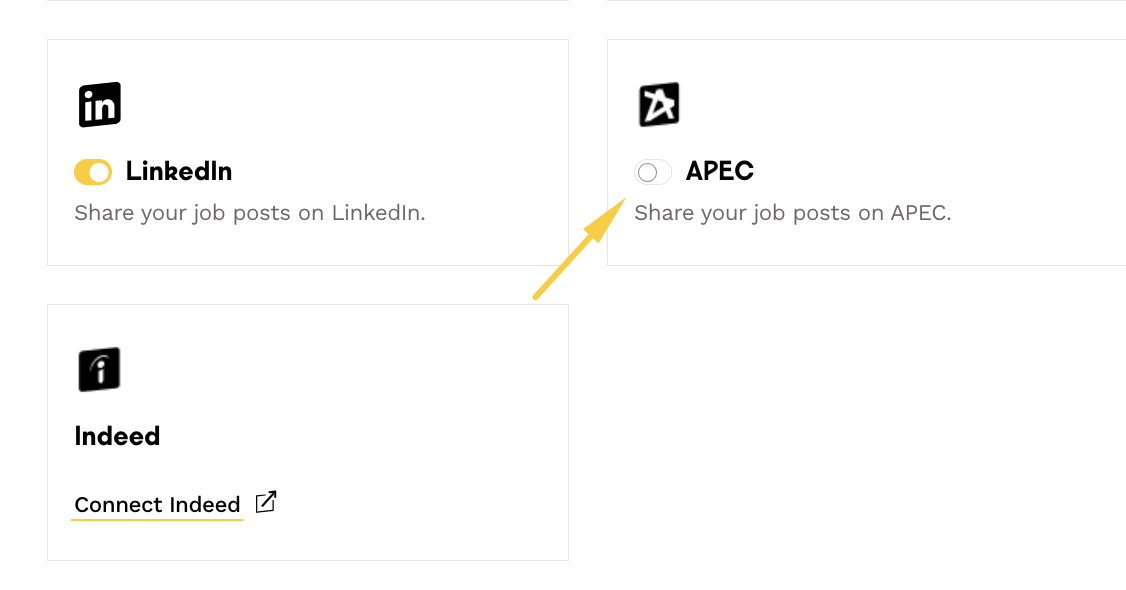 ⚠️ Once the integration is set up, you can select which jobs to broadcast on APEC by going to your job post settings.