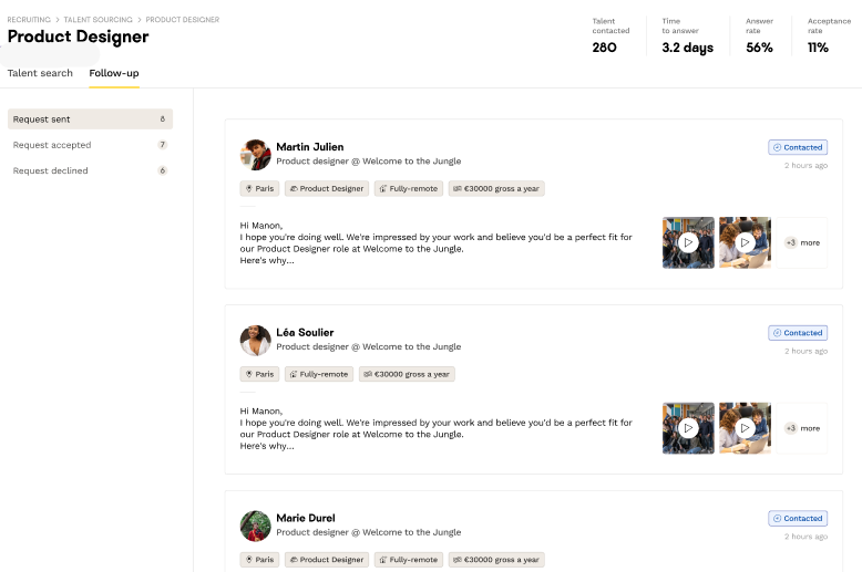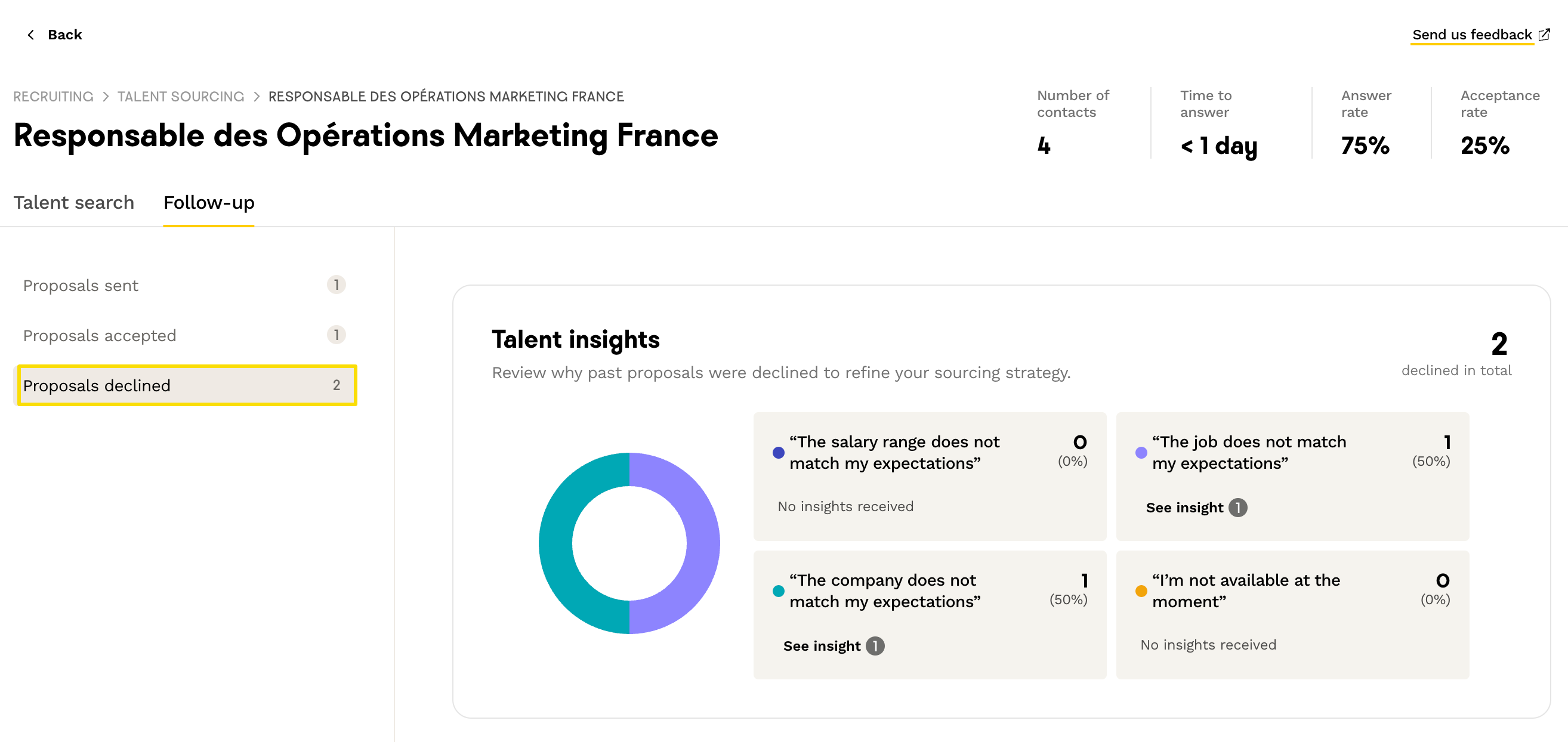 In the “Declined Proposals” section, you’ll also see the reasons behind talents’ refusals. These insights can help improve your future sourcing efforts!
