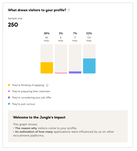 Beyond the reasons for visiting, this survey also gives you an estimated percentage of candidates influenced by your profile, who then applied via another platform (e.g. career site, cooption, etc.).
