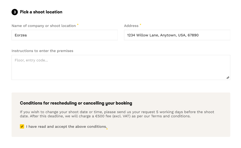 You will need to indicate the address where your photoshoot & videoshoot will take place, as well as additional information to facilitate access to this location:
