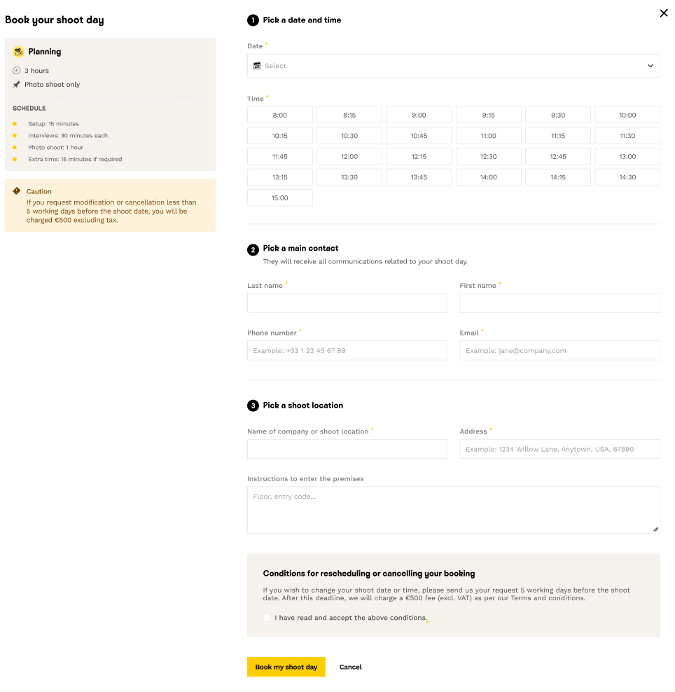 ⚠️ The indicated time slot is in the Europe/Paris time zone (GMT+2). If you wish to request an international shoot, make sure to indicate these specific details in the "Shoot location" section, in addition to the address.