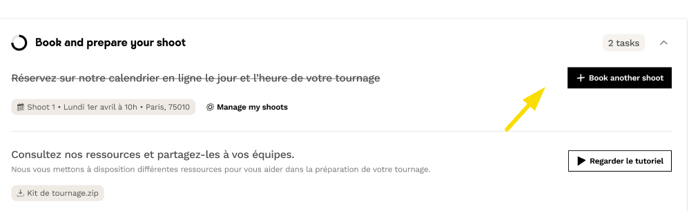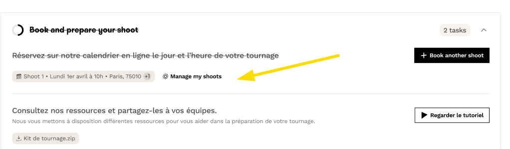 Once your three dates are booked, you can find all related information by clicking on "Manage my shoots." We explain in detail in this article how to change or cancel a shoot date.