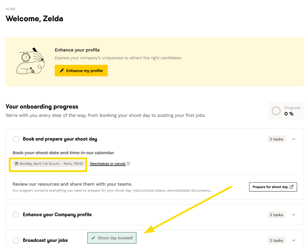Once your request has been validated, a "shoot day booked" message will appear on your screen and your task list will be updated instantly: