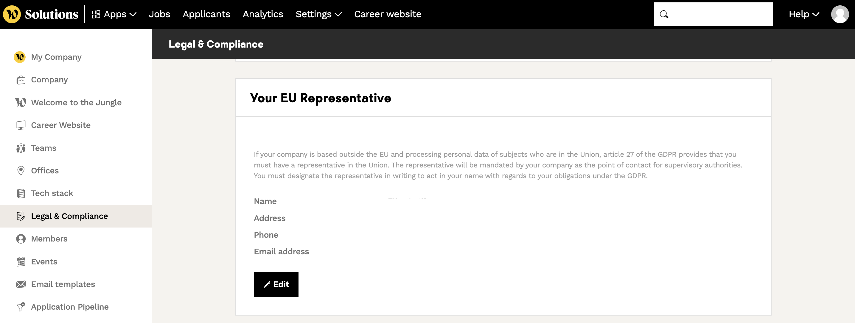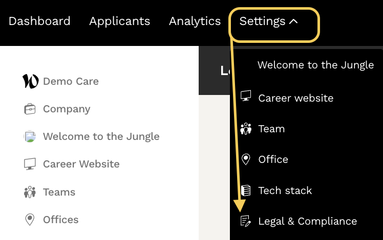 - Go to the "Legal & Compliance" section in the Settings tab of the WttJ Solutions ATS