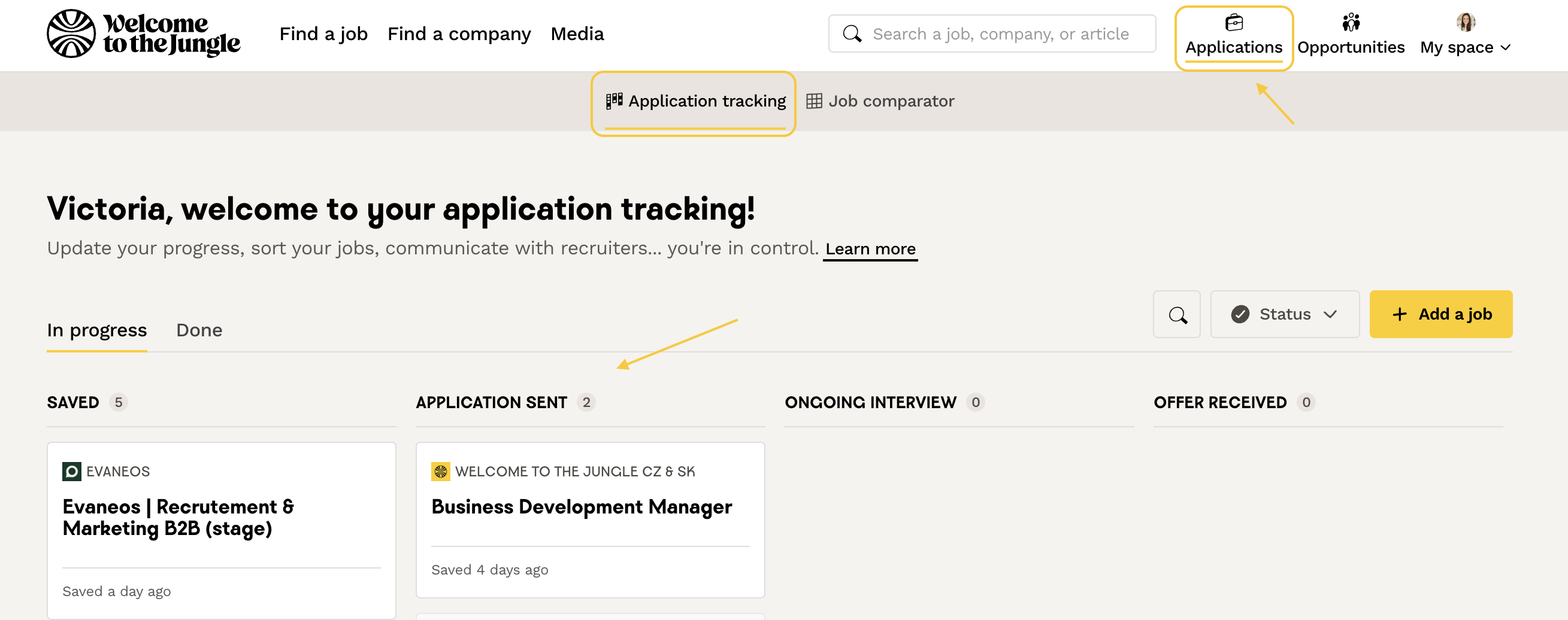 If you have sent applications and you want to find them, go to your personal space on Welcome to the Jungle :