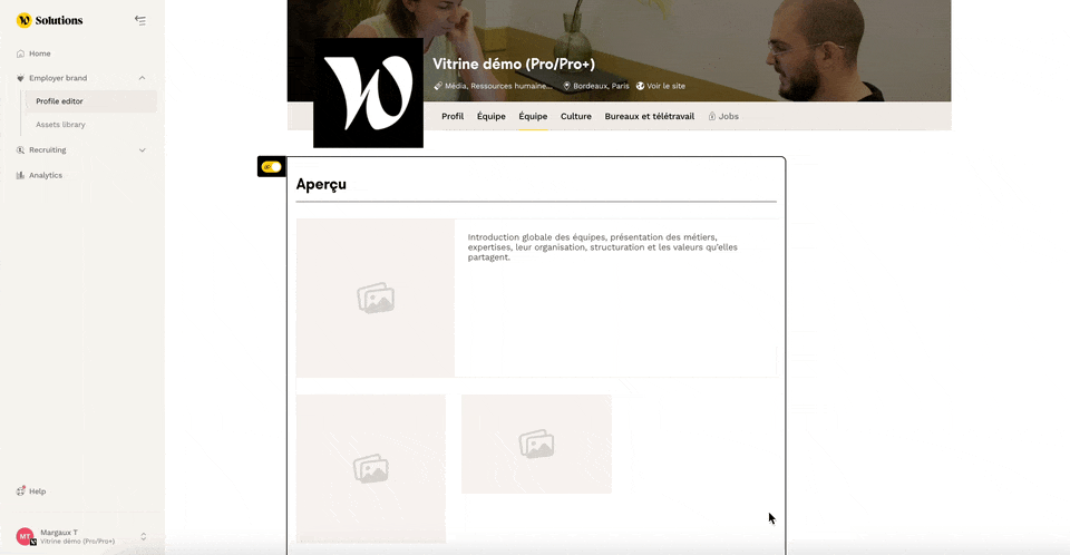 Une fois votre vitrine prĂȘte, vous pourrez la prĂ©visualiser et la modifier depuis lâĂditeur de Vitrine ! Pour pouvoir accĂ©der Ă lâĂditeur, rendez-vous dans la partie "Marque Employeur" depuis la plateforme