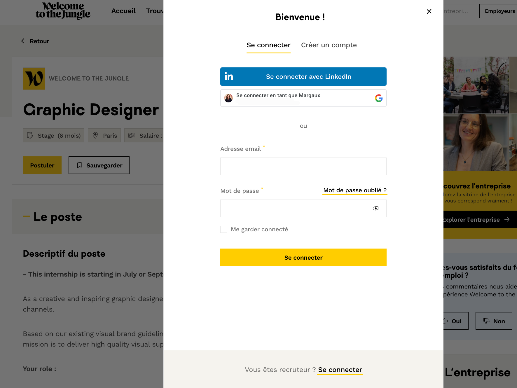Si vous nâĂȘtes pas connectĂ©, on va vous demander de le faire, ou de vous crĂ©er un compte candidat (Rien de plus simple, et on vous explique tout ici !).