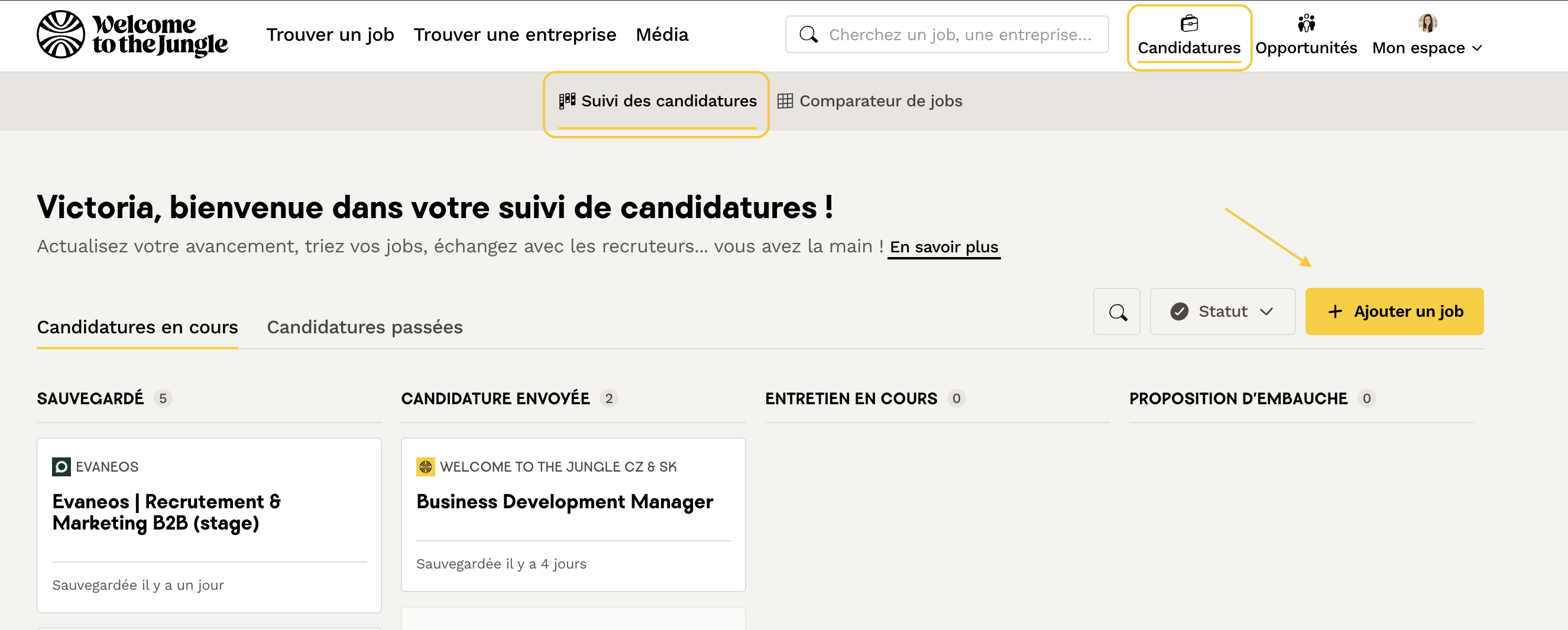 Pour ce faire, il suffit de cliquer sur "Ajouter un job" pour intégrer des cartes candidatures provenant hors du site Welcome to the Jungle, et compléter les informations en fonction :