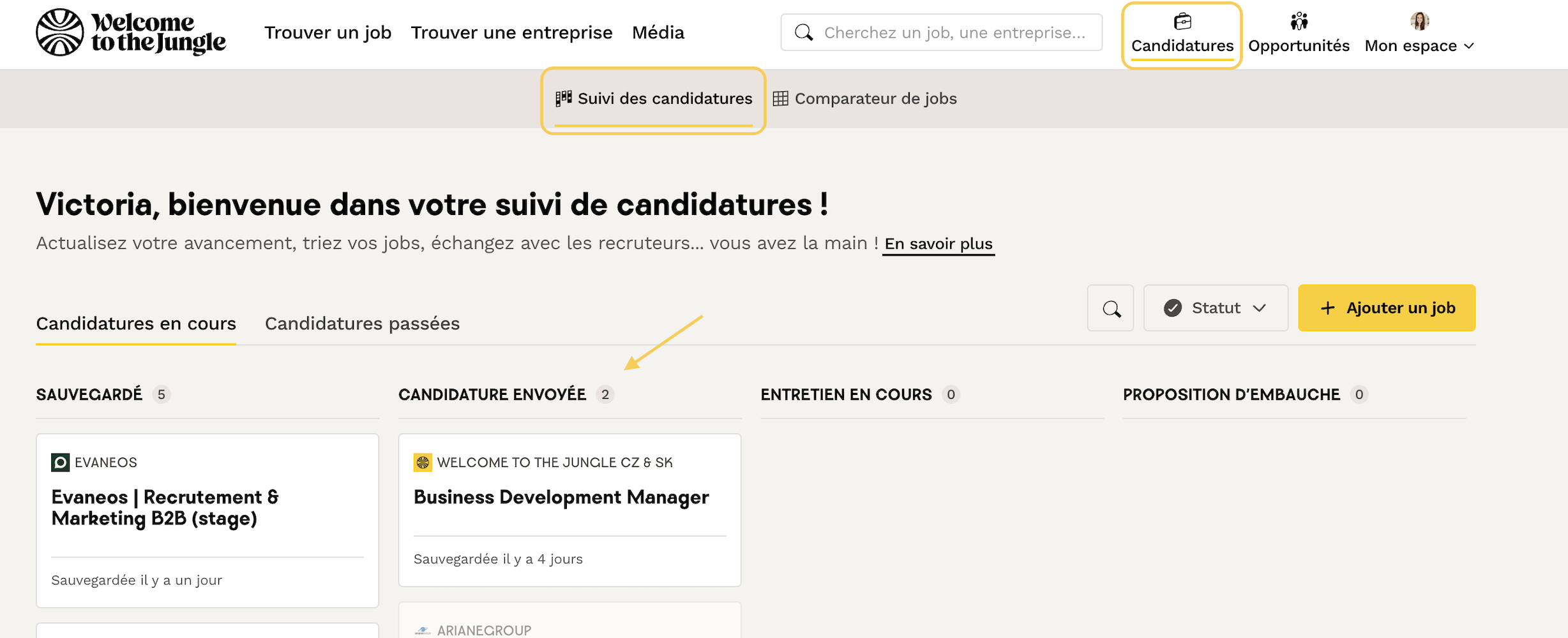 Dans le premier cas, oĂč vous avez envoyĂ© votre candidature depuis notre formulaire, vous pouvez retrouver votre candidature dans votre espace "Candidatures", puis dans lâonglet âSuivi des candidaturesâ, dans la partie "Candidature envoyĂ©e" du tableau :