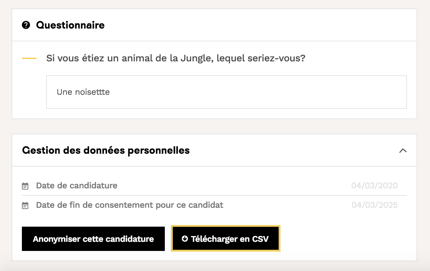 - Un bouton "Télécharger en CSV" - Cliquez sur Télécharger en CSV pour obtenir le fichier contenant toutes les données personnelles de cette candidature