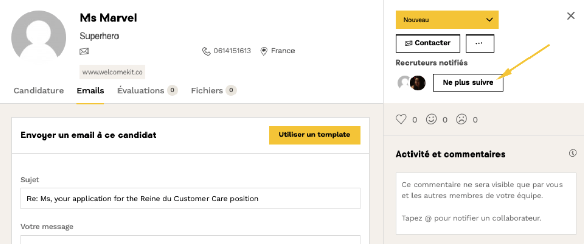 Pour désactiver le suivi d’une fiche candidat, cliquez sur le bouton “Ne plus suivre” en haut à droite de la fiche du candidat :
