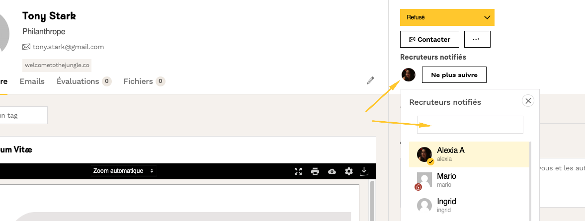 Vous pouvez également inviter d’autres recruteurs à suivre la fiche d’un candidat. Pour cela, vous pouvez cliquer sur l’icône à gauche du bouton “Suivre/Ne plus suivre”, une liste va apparaître et il vous suffit de sélectionner le recruteur de votre choix :