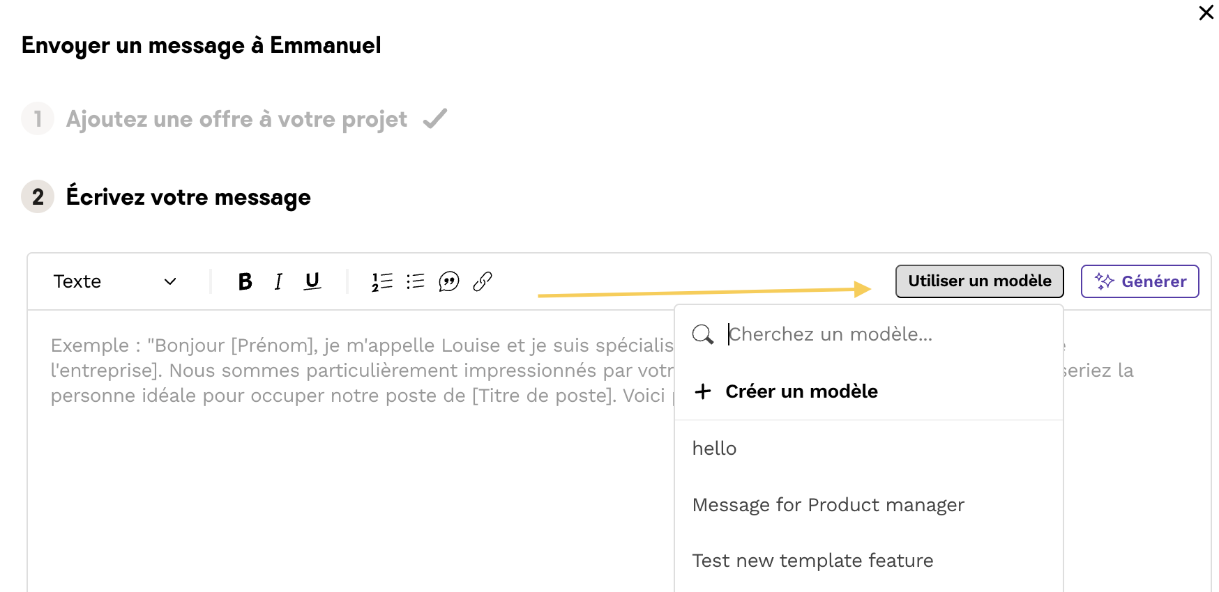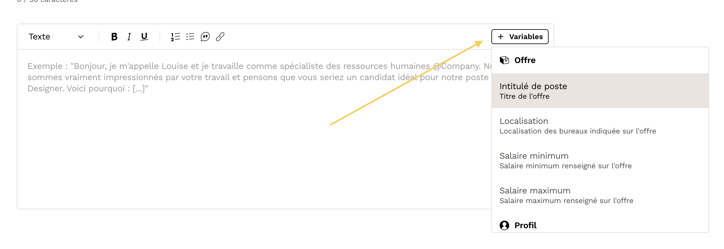 Ces dernières pré-rempliront automatiquement votre message avec les informations du talent ou de l'offre d'emploi que vous présentez au candidat.