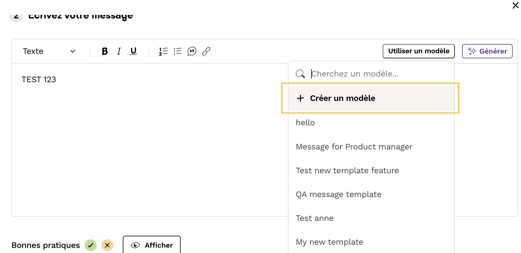 💡 Astuce : Vous avez écrit un message et souhaitez le conserver en tant que modèle d'email ? Cliquez sur l'option "Utiliser un modèle" puis "+ créer un modèle" : votre message sera pré-enregistré et vous n'aurez plus qu'à le nommer et l'enregistrer.
