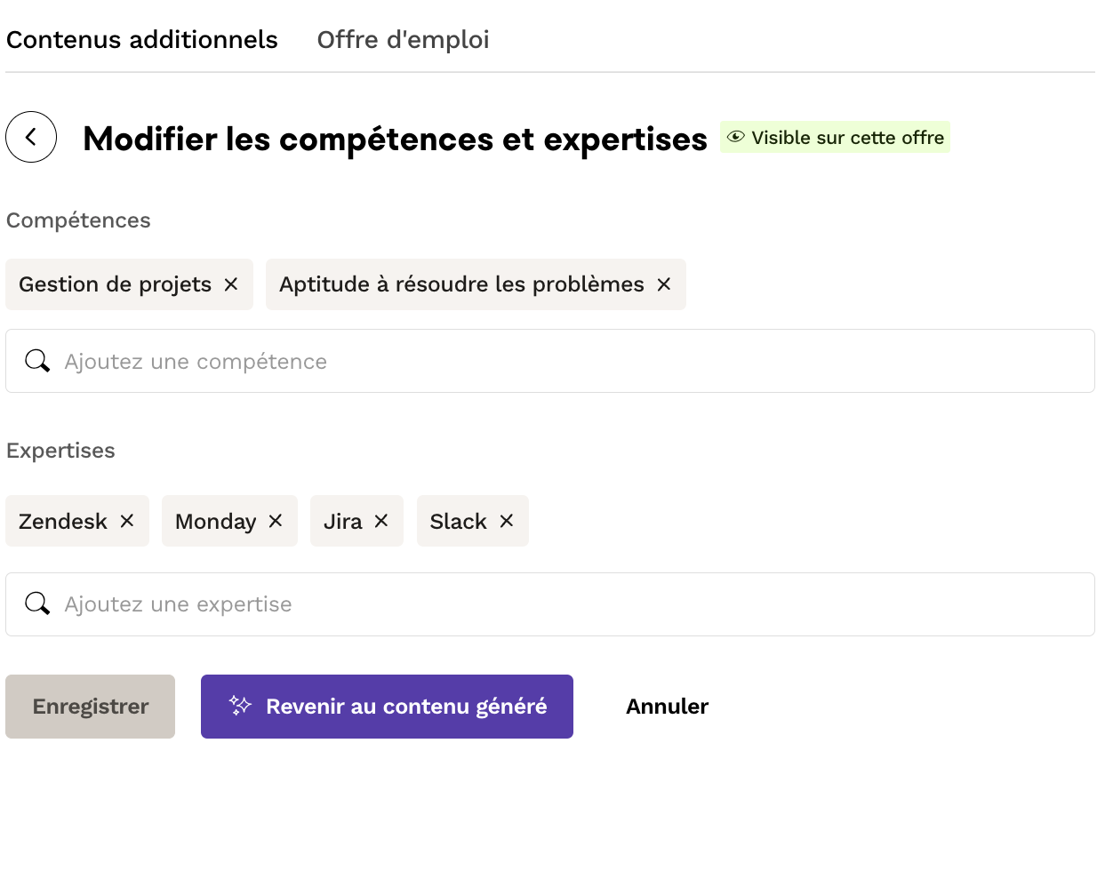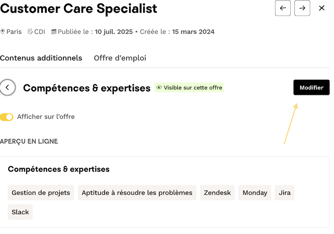 Cette fonctionnalité permet d'afficher automatiquement sur les offres un aperçu des compétences attendues pour le poste. Il est généré par défaut par une IA mais il est possible de modifier ces informations depuis l’offre en question, en cliquant sur le contenu additionnel “compétences et expertises” puis “modifier” :