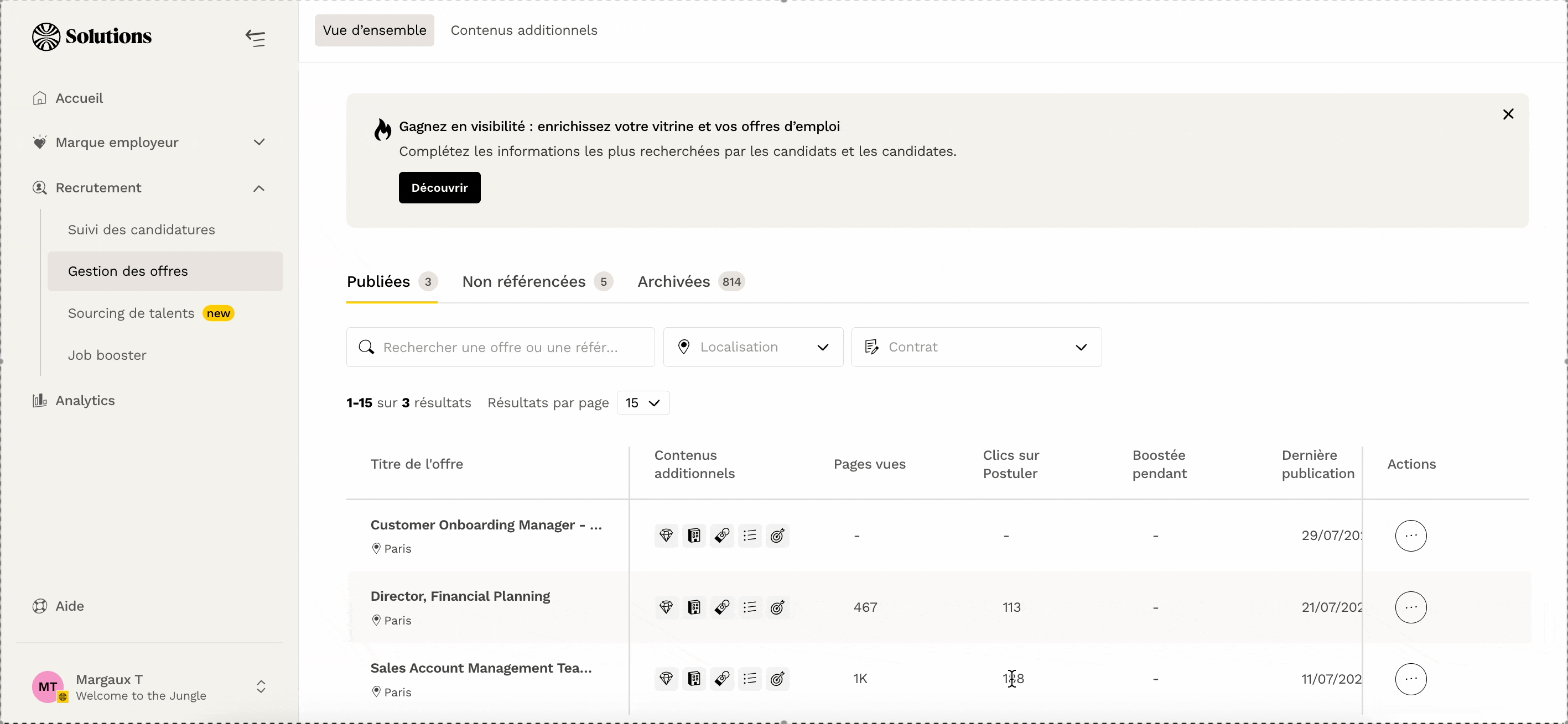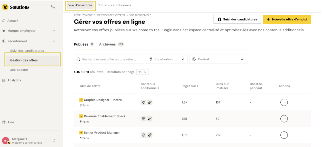 💡 La section 'Gestion des offres' a été conçue pour vous offrir une vue d'ensemble des offres actuellement publiées sur votre vitrine, vous permettant ainsi de les gérer efficacement depuis un seul espace. Peu importe si vous utilisez l’ATS de Welcome to the Jungle ou un ATS externe ces informations seront bien disponibles dans les deux cas !