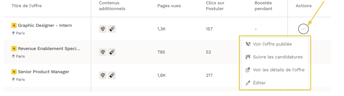 - "Éditer” : Cela vous permet de modifier l’offre directement depuis cet espace.(accessible uniquement pour les entreprises utilisant l’ATS Welcome to the Jungle Solutions )