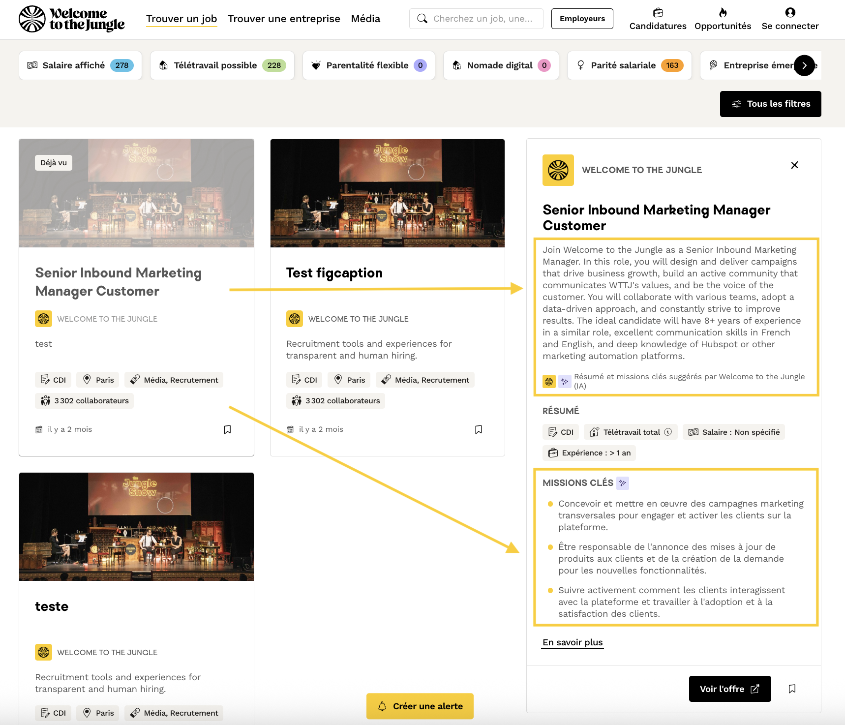- "Suivre les candidatures” : Ce raccourci vous permet d'accéder à la pipeline de l’offre. (accessible uniquement pour les entreprises utilisant l’ATS Welcome to the Jungle Solutions)