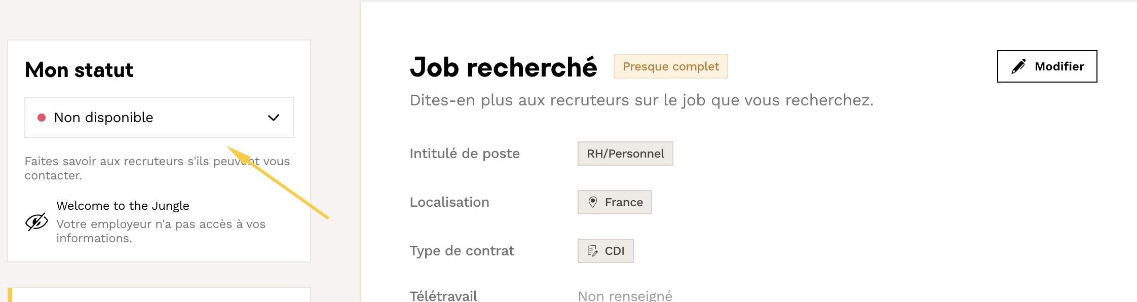 â ïž Si vous sĂ©lectionnez "Non disponible", votre profil Candidat restera confidentiel et ne sera pas visibles par les recruteurs. Seules les entreprises pour lesquelles vous aurez postulĂ© auront accĂšs aux informations que vous aurez partager dans le formulaire de candidature.