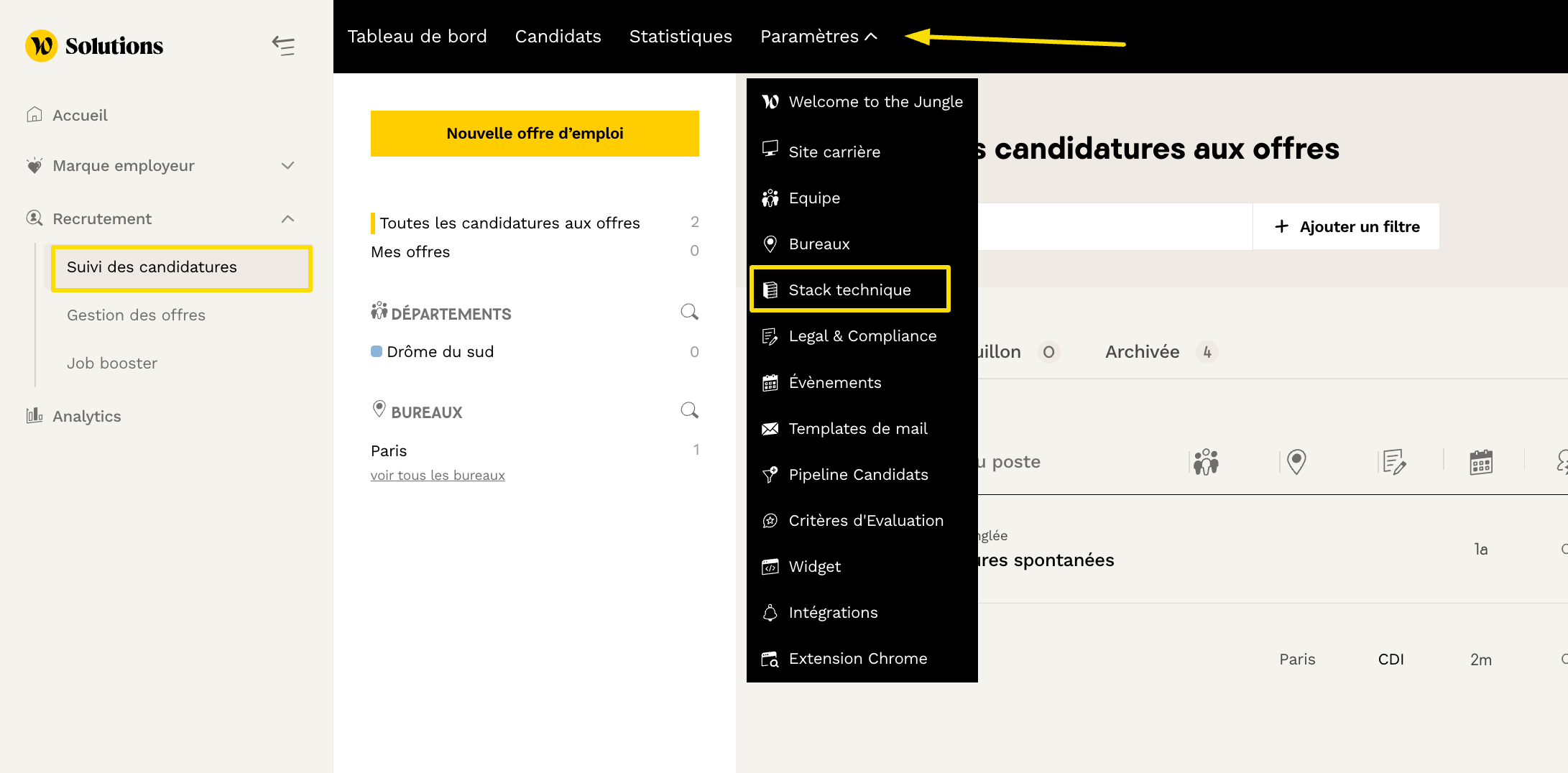 Welcome to the Jungle Solutions ATS vous permet de mettre Ă jour l'onglet tech de votre vitrine Welcome to the Jungle depuis votre dashboard, et de rĂ©fĂ©rencer les stacks que vous utilisez, et ĂȘtre plus visibles auprĂšs des candidats.