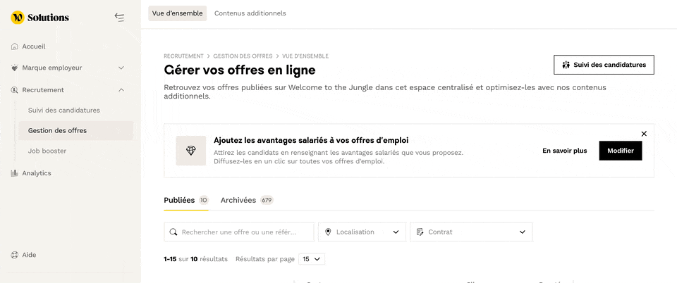Si vous utilisez notre ATS, ce tableau de bord est essentiel pour vous. De là, vous pouvez créer, modifier et mettre à jour vos offres, et comprendre leurs performances en un seul coup d'œil.
