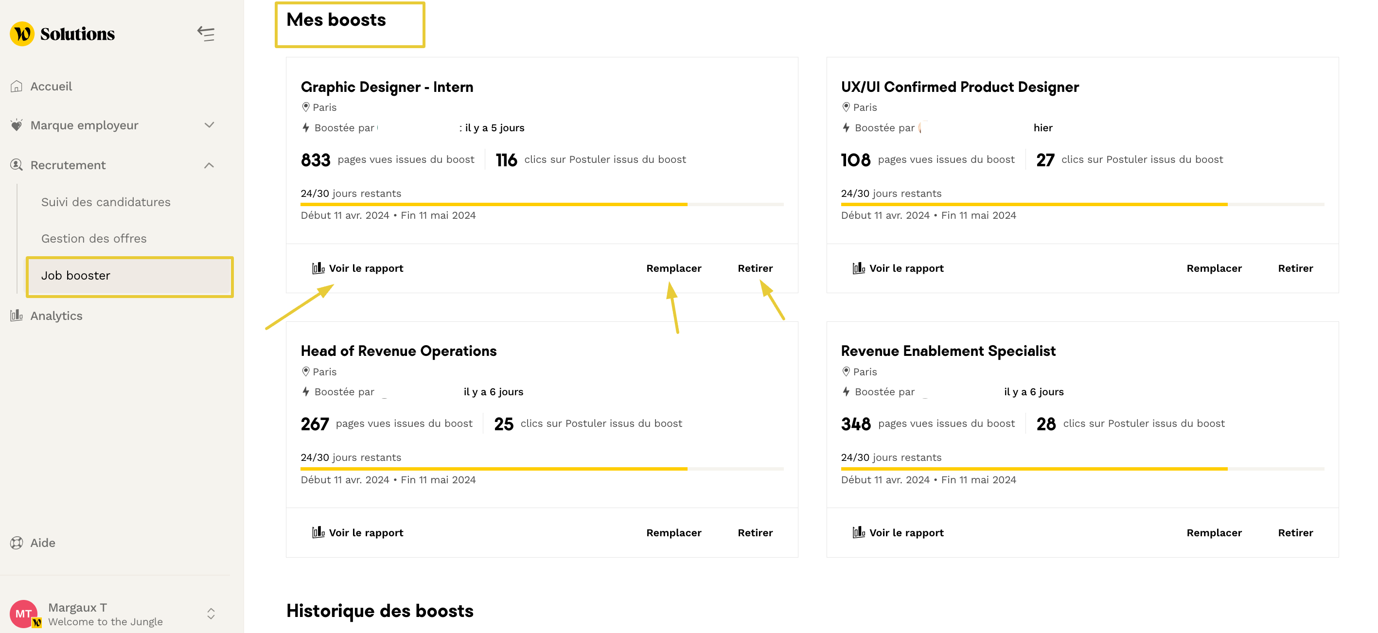 Ici, vous pouvez voir vos offres actuellement boostées, il sera possible de :