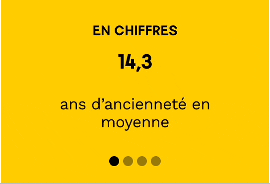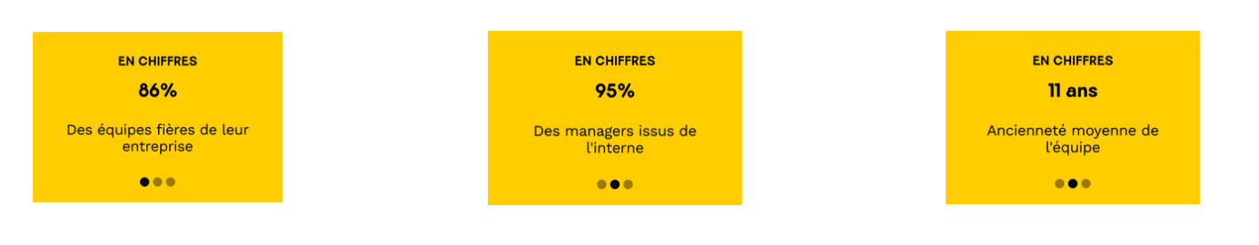 Le carrousel de chiffres clés est l’encart jaune situé à droite de la répartition des collaborateurs. Vous pouvez entrer jusqu’à 3 chiffres clés, qui parlent de vos équipes. Les chiffres vont défiler de manière dynamique une fois sur l’onglet Equipe.