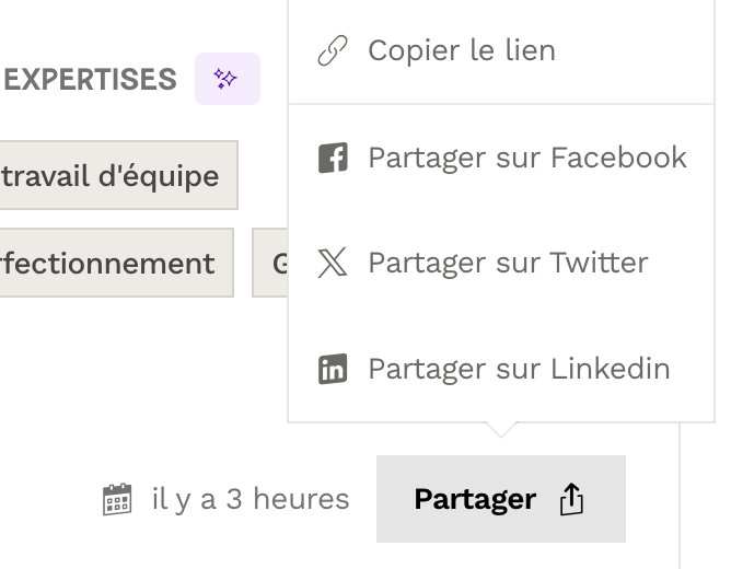 Depuis l’offre d’emploi, vous avez un bouton “Partager” vous permettant de copier automatiquement le lien, et de le partager sur les réseaux sociaux notamment Facebook, Twitter et surtout LinkedIn, le réseau social professionnel par excellence.