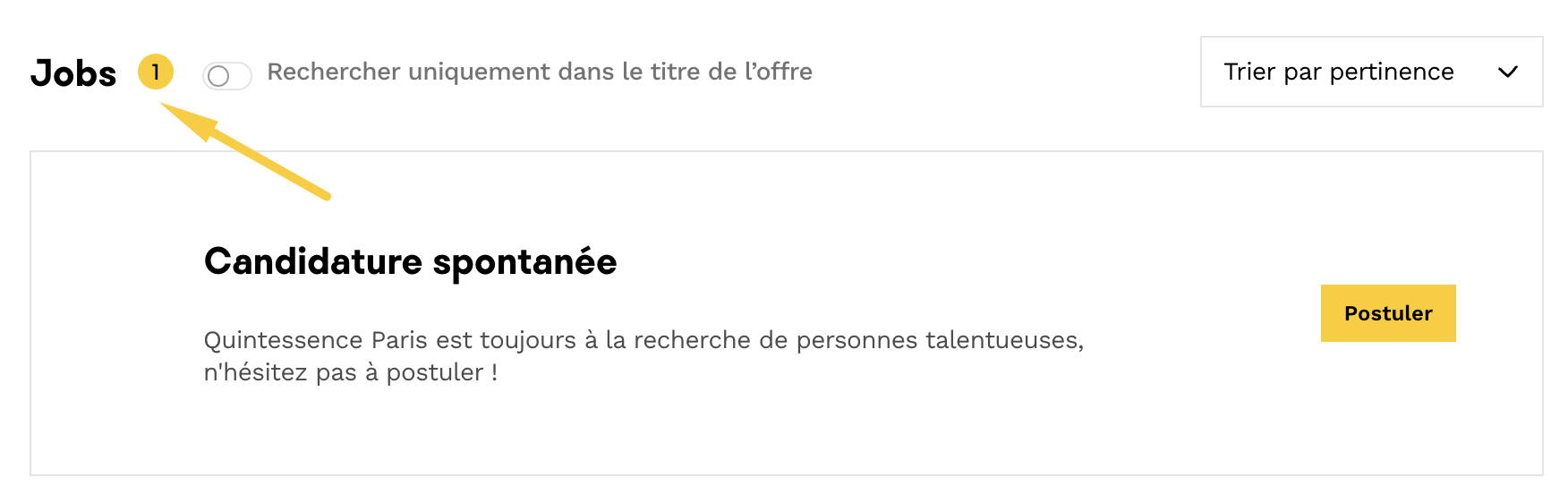 Par défaut et sauf manipulation contraire, la pastille jaune affiche au minimum 1 job, correspondant à la candidature spontanée. Cela signifie que même si vous n’avez publié aucune offre à pourvoir, le candidat peut postuler dans votre entreprise de manière spontanée et proactive.