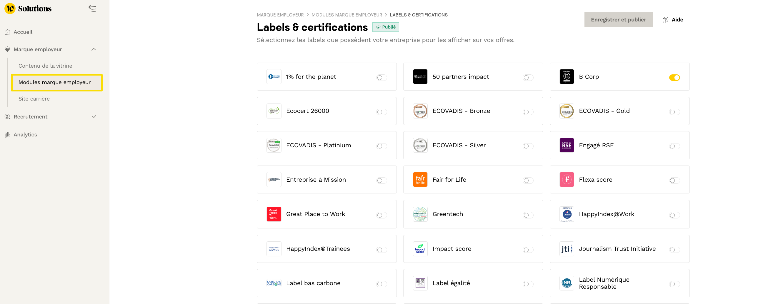 Pour information, nous mettons à votre disposition une partie modules marque employeur, au sein de laquelle vous pouvez cocher les labels, avantages salariés (etc) que vous proposez. Ils seront ensuite ajoutés sur la droite de vos offres pour les enrichir et une visibilité maximale auprÚs des candidats !