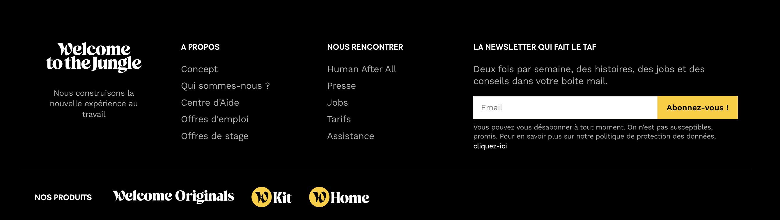 En bas de la page d’accueil Welcome to the Jungle, vous pouvez découvrir un footer “Restez informés!”