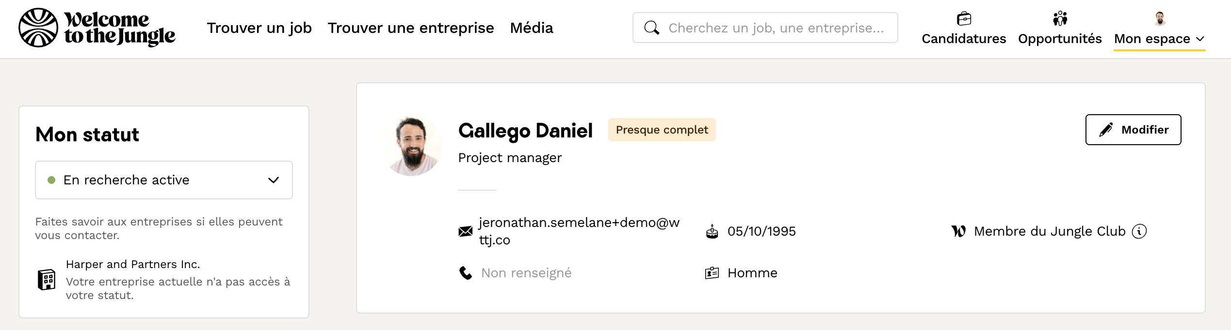 En vous connectant sur Welcome to the Jungle, vous pouvez ajouter vos informations personnelles dans la section Profil :