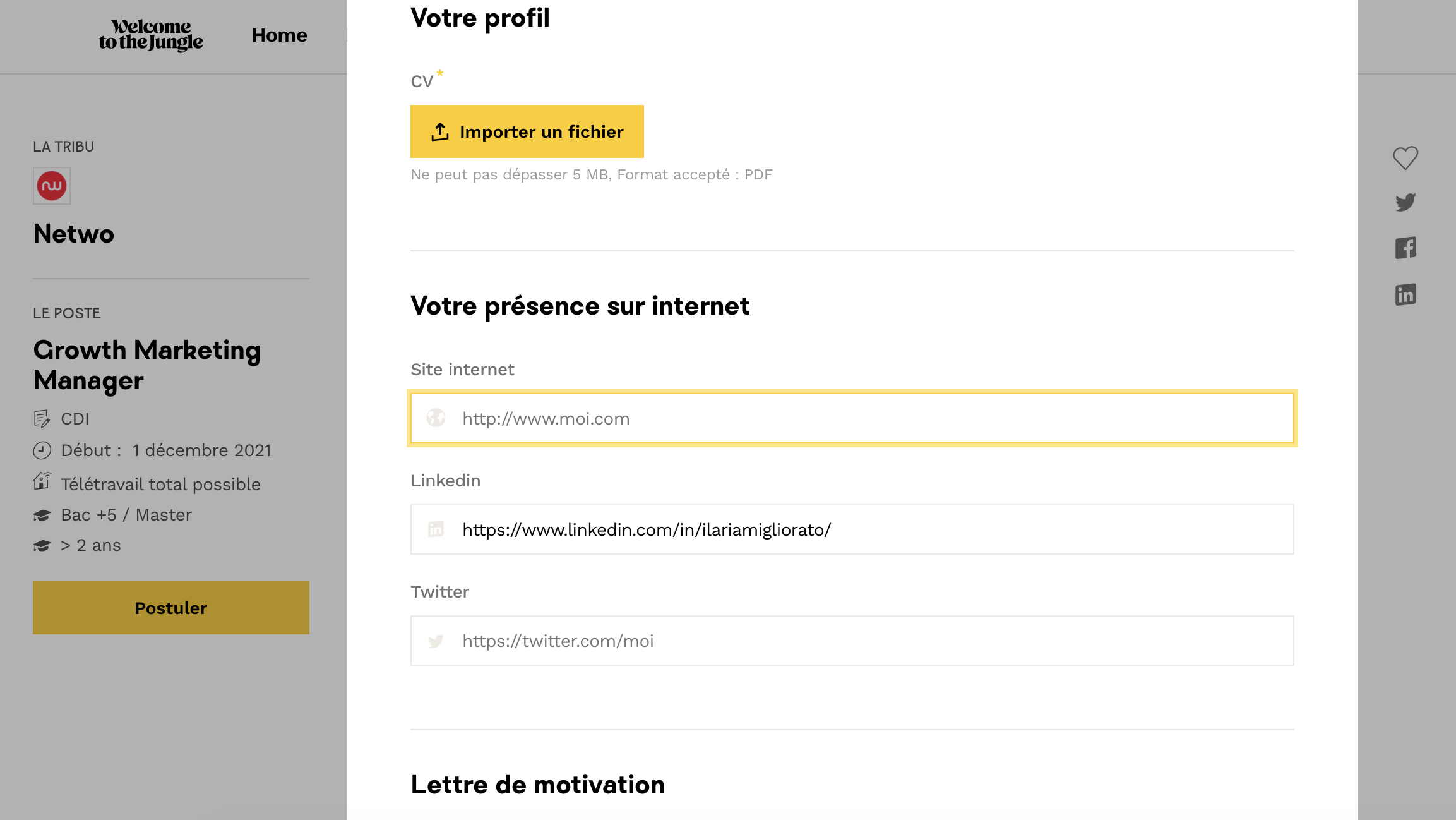 Une fois trouvĂ© le bon poste, c'est le temps de postuler ! Pour le faire vous devez ĂȘtre connectĂ© Ă votre compte. De cette façon, vos informations personnelles seront dĂ©jĂ prĂ©sentes dans les champs de candidatures, et vous n'aurez qu'Ă complĂ©ter votre candidature avec votre CV et votre lettre de motivation :
