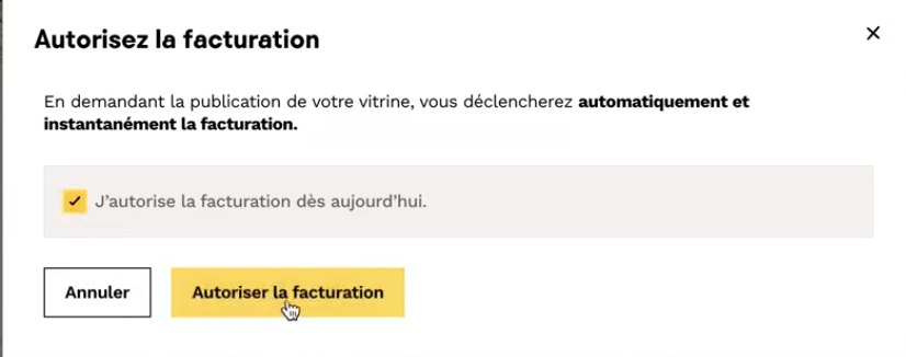 Toute demande de publication de votre vitrine entraîne l’activation de la facturation de votre abonnement. C’est pourquoi, après avoir cliqué sur le bouton “Publier”, vous devrez autoriser la facturation de votre abonnement :