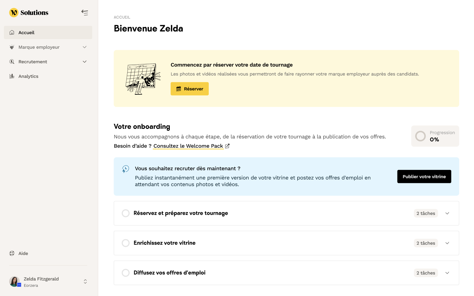 En parallèle, vous pourrez poursuivre votre processus d’onboarding avec la planification de votre tournage, la construction de votre vitrine à votre image, et cela, tout en démarrant vos recrutements.