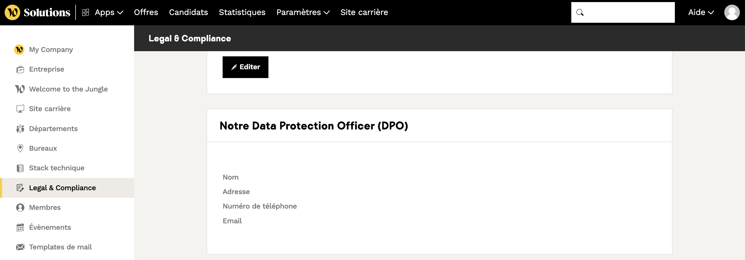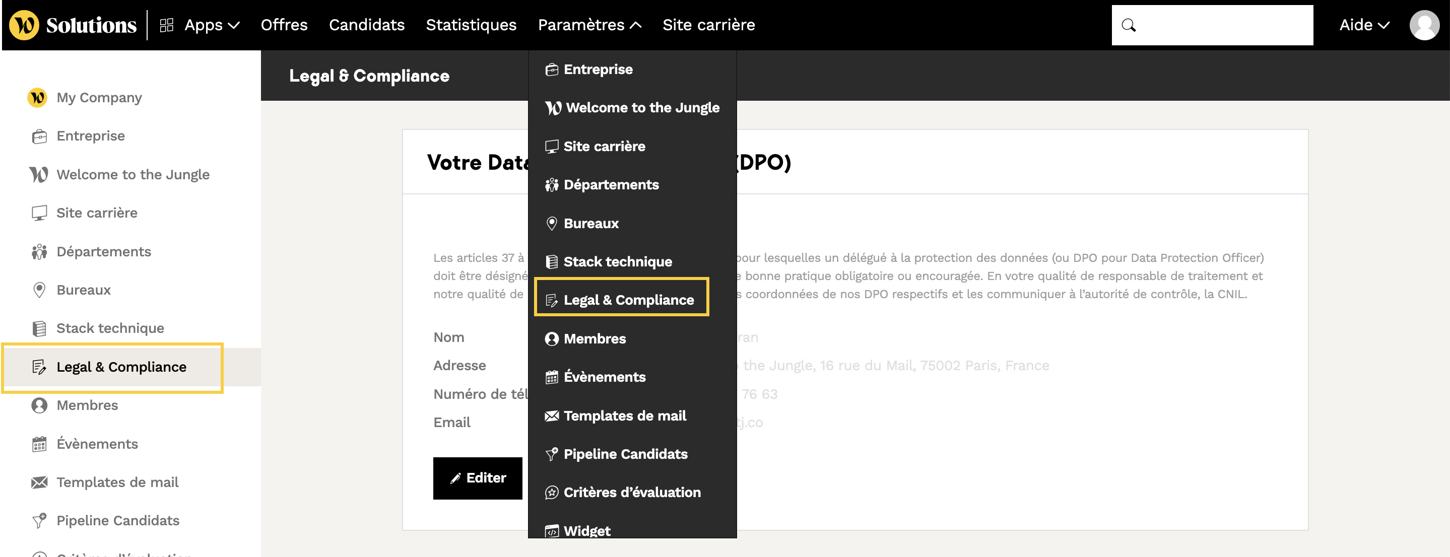 Par contre, si votre entreprise utilise exclusivement l’ATS, sans abonnement Welcome to the Jungle, ce dernier est disponible dans le volet "Legal & Compliance":
